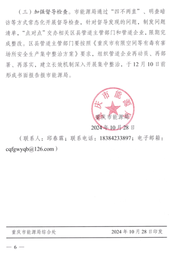 重慶市能源局印發(fā)了《關(guān)于加強全市油氣長輸管道有限空間作業(yè)安全管理的通知》(渝能源油氣〔2024〕69號),現(xiàn)將通知轉(zhuǎn)發(fā)給你們,請各管道企業(yè)按照文件要求,狠抓工作落實,確保油氣長輸管道領(lǐng)域有限空間作業(yè)安全。區(qū)發(fā)展改革委將根據(jù)實際情況對各單位有限空間等有毒有害場所作業(yè)情況開展監(jiān)督檢查,嚴肅處理違法行為。