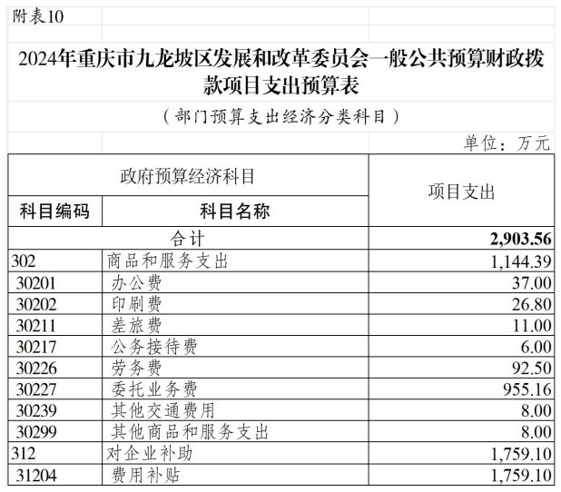 10.2024年重慶市九龍坡區(qū)發(fā)展和改革委員會一般公共預(yù)算財政撥款項目支出預(yù)算表(部門預(yù)算支出經(jīng)濟(jì)分類科目)