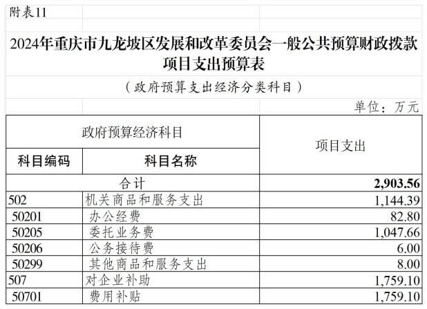 11.2024年重慶市九龍坡區(qū)發(fā)展和改革委員會一般公共預(yù)算財政撥款項目支出預(yù)算表(政府預(yù)算支出經(jīng)濟(jì)分類科目)