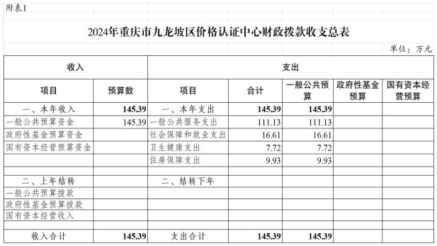 附表:1.2024年重慶市九龍坡區(qū)價格認證中心財政撥款收支總表