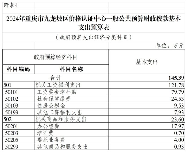 4.2024年重慶市九龍坡區(qū)價格認證中心一般公共預算財政撥款基本支出預算表(政府預算支出經濟分類科目)