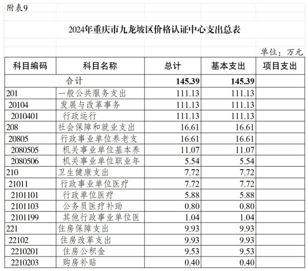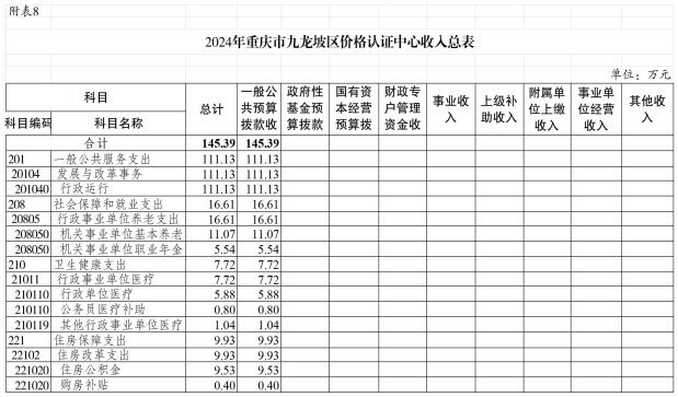 8.2024年重慶市九龍坡區(qū)價格認證中心收入總表9.2024年重慶市九龍坡區(qū)價格認證中心支出總表(功能科目分類到項)