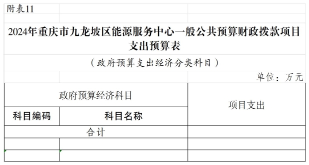 11.2024年重慶市九龍坡區(qū)能源服務(wù)中心一般公共預(yù)算財(cái)政撥款項(xiàng)目支出預(yù)算表(政府預(yù)算支出經(jīng)濟(jì)分類科目)