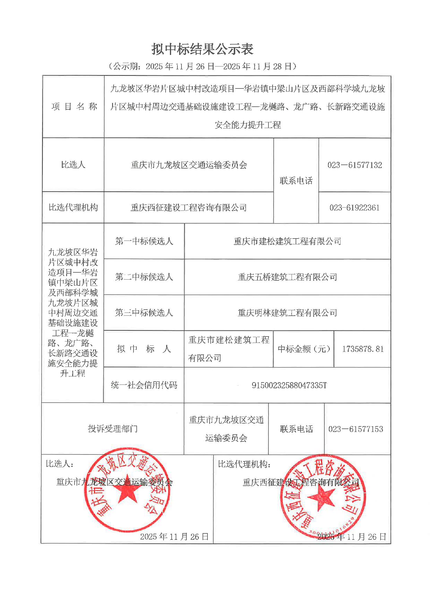 九龍坡區(qū)華巖片區(qū)城中村改造項目—華巖鎮(zhèn)中梁山片區(qū)及西部科學城九龍坡片區(qū)城中村周邊交通基礎(chǔ)設(shè)施建設(shè)工程—龍樾路、龍廣路、長新路交通設(shè)施安全能力提升工程擬中標結(jié)果公示