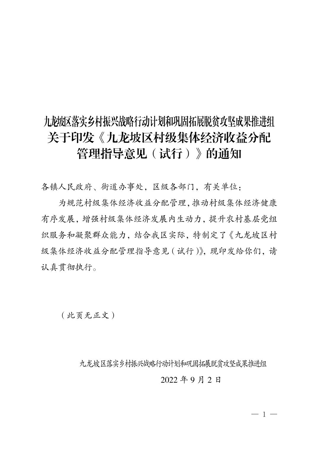 關(guān)于印發(fā)《九龍坡區(qū)村級(jí)集體經(jīng)濟(jì)收益分配 管理指導(dǎo)意見(試行)》的通知