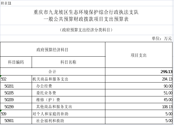 11.2023年重慶市九龍坡區(qū)生態(tài)環(huán)境保護綜合行政執(zhí)法支隊一般公共預(yù)算財政撥款項目支出預(yù)算表(政府經(jīng)濟分類科目)