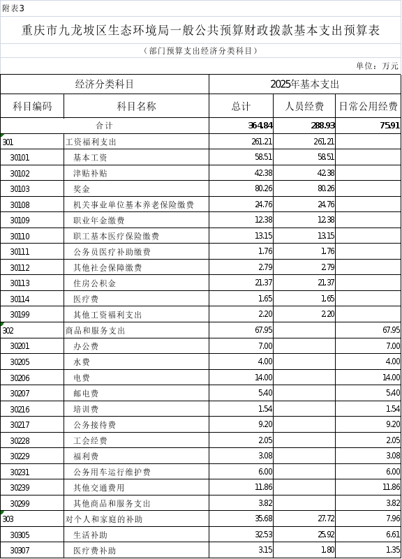 3.2025年重慶市九龍坡區(qū)生態(tài)環(huán)境局(本級(jí))一般公共預(yù)算財(cái)政撥款基本支出預(yù)算表