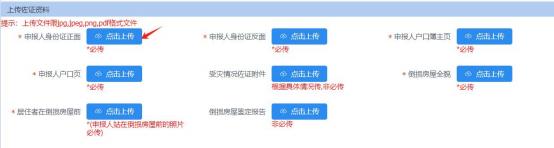 3.上傳佐證資料:上傳申報(bào)人身份證正面、申報(bào)人身份證反面、申報(bào)人戶口簿主頁(yè)、申報(bào)人戶口頁(yè)、住房倒損照片、居住者在倒損房屋前等必傳資料和受災(zāi)情況佐證材料、倒損房屋鑒定報(bào)告非必傳資料。如圖7-7所示: