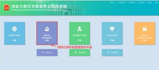 第一步:在主頁(yè)面點(diǎn)擊【倒損住房恢復(fù)重建救助申報(bào)】按鈕進(jìn)