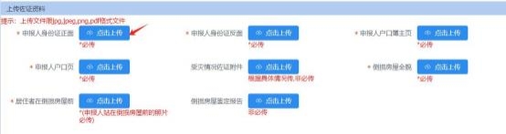 3.上傳佐證資料:上傳申報(bào)人身份證正面、申報(bào)人身份證反面、申報(bào)人戶(hù)口簿主頁(yè)、申報(bào)人戶(hù)口頁(yè)、住房倒損照片、居住者在倒損房屋前等必傳資料和受災(zāi)情況佐證材料、倒損房屋鑒定報(bào)告非必傳資料。如圖7-7所示: