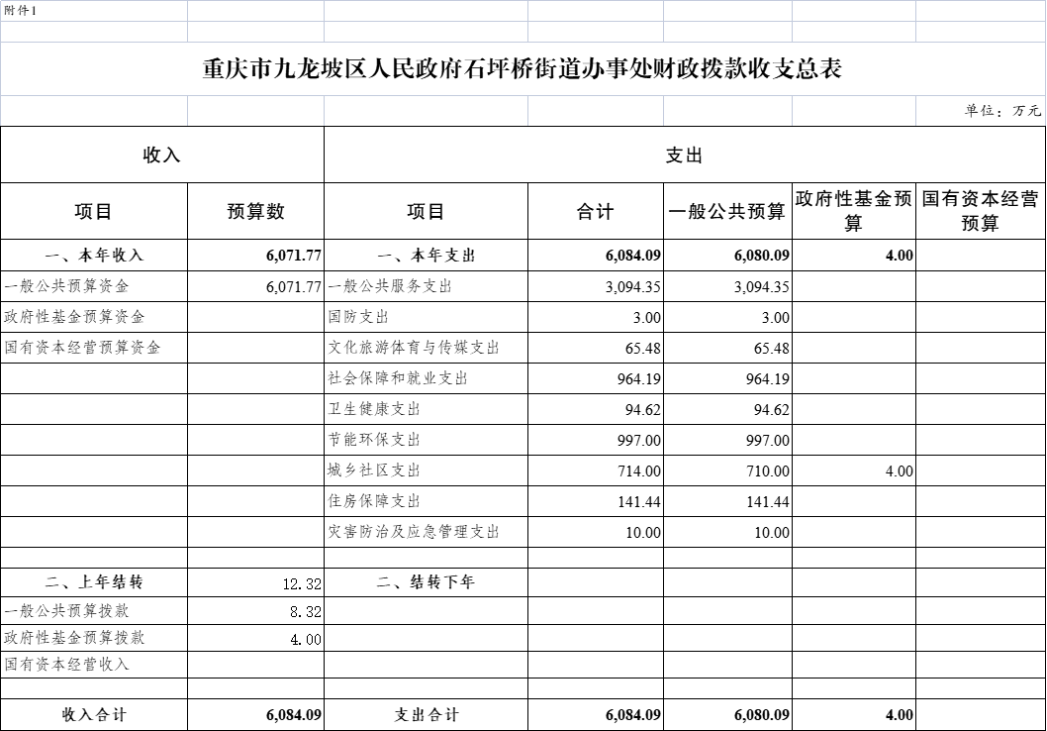 重慶市九龍坡區(qū)人民政府石坪橋街道辦事處部門收支總表 | |||