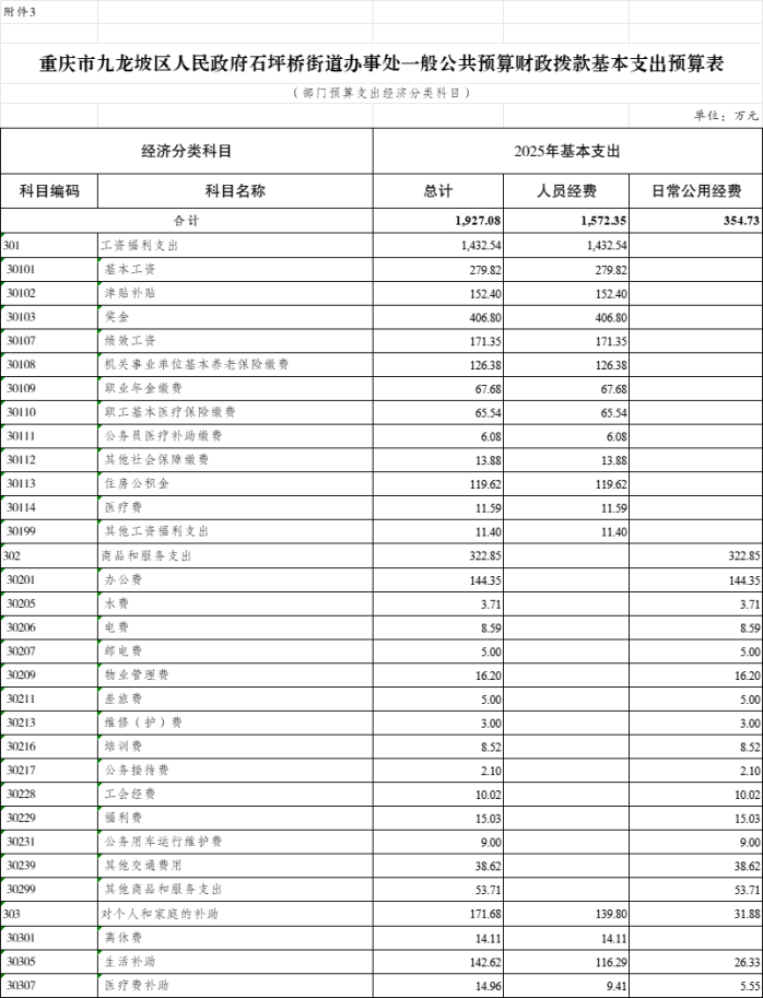 3.2025年九龍坡區(qū)人民政府石坪橋街道辦事處一般公共預(yù)算財政撥款基本支出預(yù)算表