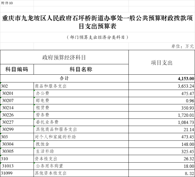10.2025年九龍坡區(qū)人民政府石坪橋街道辦事處一般公共預(yù)算財政撥款項(xiàng)目支出預(yù)算表(部門預(yù)算支出經(jīng)濟(jì)分類科目)