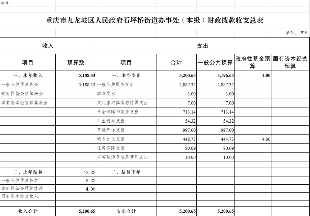 附表: 1.2025年九龍坡區(qū)人民政府石坪橋街道辦事處(本級)單位財政撥款收支總表