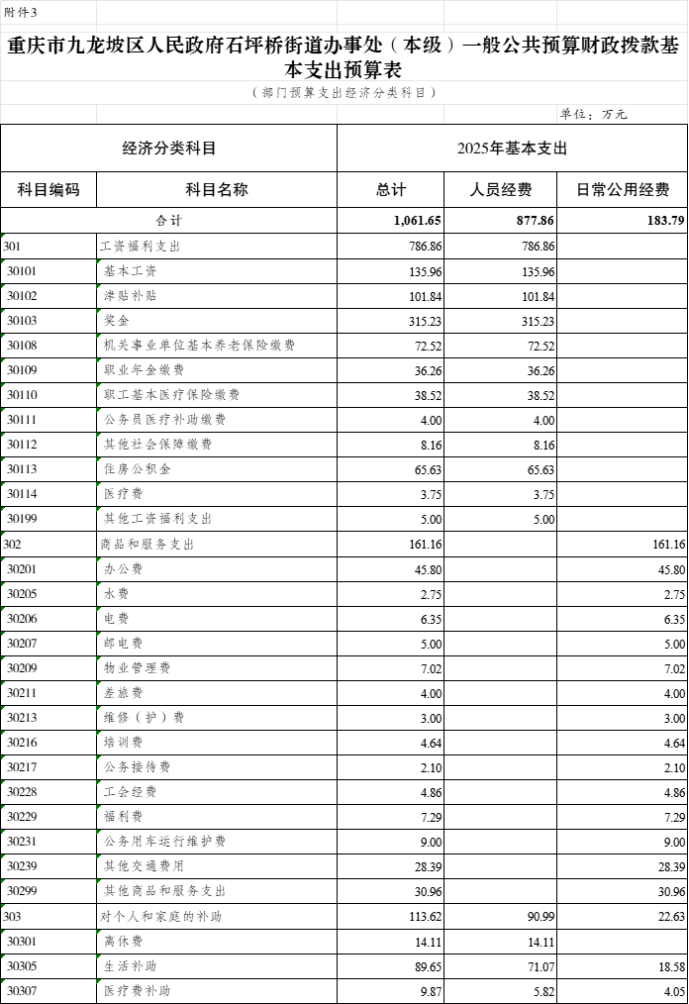 3.2025年九龍坡區(qū)人民政府石坪橋街道辦事處(本級)一般公共預算財政撥款基本支出預算表