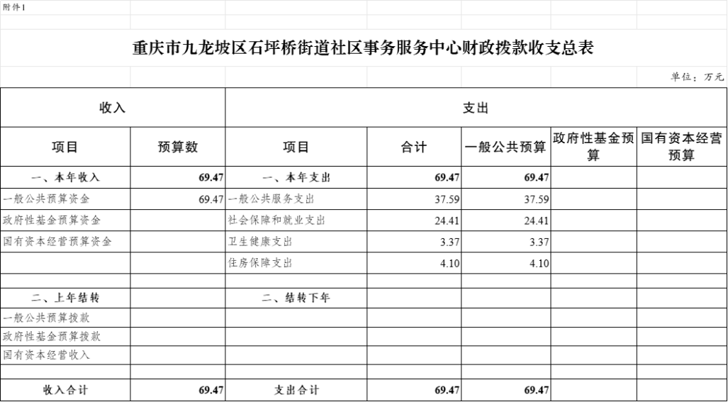 附表: 1.2025年九龍坡區(qū)石坪橋街道社會(huì)事務(wù)服務(wù)中心單位財(cái)政撥款收支總表
