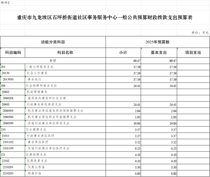 重慶市九龍坡區(qū)石坪橋街道社區(qū)事務(wù)服務(wù)中心2025年單位預(yù)算情況說明