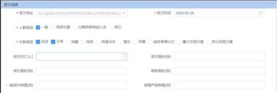 2.填寫受災(zāi)信息:受災(zāi)地址、受災(zāi)時間、人群類型、災(zāi)種類型、因災(zāi)死亡人口(人)、受災(zāi)面積(畝)、成災(zāi)面積(畝)、絕收面積(畝)、一般損壞房屋(間)、倒塌嚴(yán)損房屋(間)。如圖6-5所示: