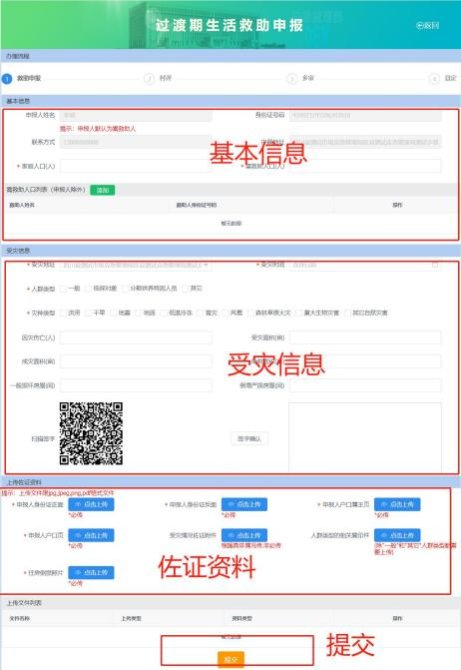 第二步:點(diǎn)擊【過渡期生活救助申報】按鈕進(jìn)入過渡期生活救助申報頁面,填寫基本信息、受災(zāi)信息、在線簽名以及上傳佐證資料。如圖6-2所示: