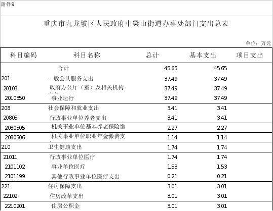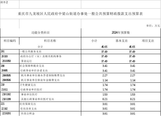2024年一般公共預(yù)算財(cái)政撥款收入45.65萬元,一般公共預(yù)算財(cái)政撥款支出45.65萬元,比2023年增加13.73萬元。其中:基本支出45.65萬元,比2023年增加13.73萬元,主要原因是政策性增資等,主要用于保障重慶市九龍坡區(qū)中梁山街道物業(yè)管理服務(wù)中心在職人員工資福利及社會(huì)保險(xiǎn)繳費(fèi),離休人員離休費(fèi),退休人員補(bǔ)助等,保障單位正常運(yùn)轉(zhuǎn)的各項(xiàng)商品服務(wù)支出;項(xiàng)目支出0萬元,比2023年增加0萬元。