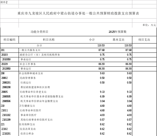 2025年一般公共預(yù)算財(cái)政撥款收入110.53萬元,一般公共預(yù)算財(cái)政撥款支出110.53萬元,比2024年增加61.01萬元。其中:基本支出110.53萬元,比2024年增加61.01萬元,主要原因機(jī)構(gòu)改革,機(jī)構(gòu)合并人員增加,主要用于保障中梁山街道社區(qū)事務(wù)服務(wù)中心在職人員工資福利及社會保險(xiǎn)繳費(fèi),離休人員離休費(fèi),退休人員補(bǔ)助等,保障單位正常運(yùn)轉(zhuǎn)的各項(xiàng)商品服務(wù)支出;項(xiàng)目支出0萬元,比2024年增加0萬元。
