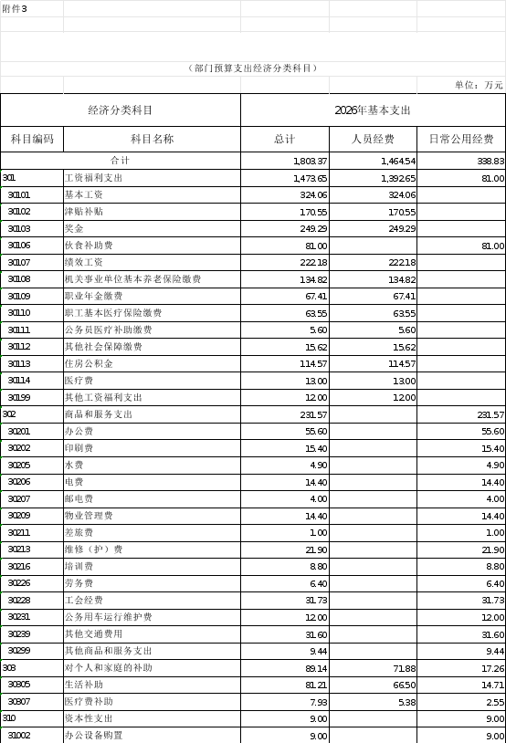 1.機關(guān)運行經(jīng)費。2026年一般公共預(yù)算財政撥款運行經(jīng)費338.83萬元,比上年增加6.09萬元,主要原因為人員待遇變更導(dǎo)致人員公用經(jīng)費變更。主要用于辦公費、印刷費、郵電費、水電費、物管費、差旅費、會議費、培訓(xùn)費及其他商品和服務(wù)支出等。