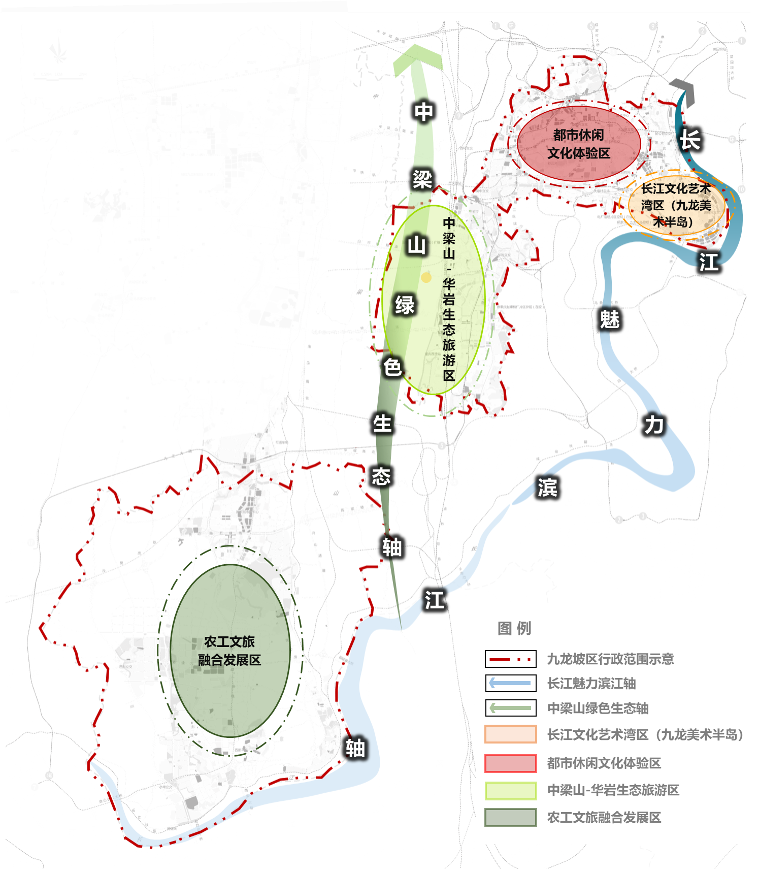 (一)全域布局,構(gòu)建文旅發(fā)展新空間。明確以推動文化和旅游深度融合為基本路徑,以重大項目建設(shè)為重要抓手,構(gòu)建起長江魅力濱江軸、中梁山綠色生態(tài)軸“兩軸”傳動,長江文化藝術(shù)灣區(qū)(九龍美術(shù)半島)、中梁山—華巖生態(tài)旅游區(qū)、都市休閑文化體驗區(qū)、農(nóng)工文旅融合發(fā)展區(qū)“四區(qū)”聯(lián)動,特色文化街區(qū)、文化創(chuàng)意園區(qū)、文旅綜合體等“多點”交相輝映的“兩軸四區(qū)多點”(2+4+N)文旅發(fā)展空間格局。
