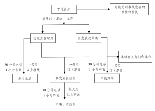 油氣長輸管道事故發(fā)生后,事發(fā)管道企業(yè)應立即向區(qū)發(fā)展改革委和區(qū)應急局報告,并及時向可能受到事故危害的單位和居民通告。發(fā)展改革委、區(qū)應急局接報并核實后,及時向本級黨委政府和上級主管部門報告事故信息。