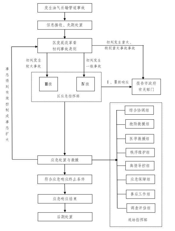 Ⅰ級、Ⅱ級響應由區(qū)應急指揮部提出應急響應的建議,報請重慶市油氣長輸管道事故應急處置指揮部批準同意,啟動響應。