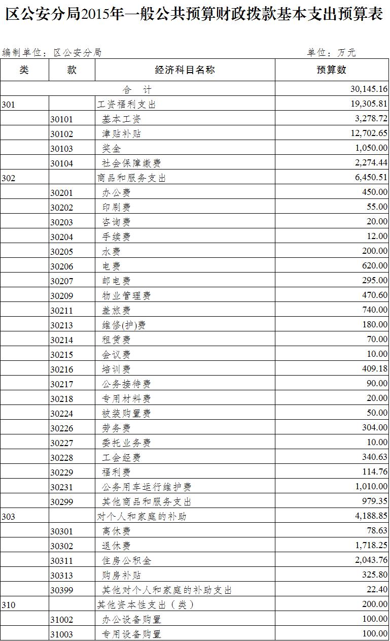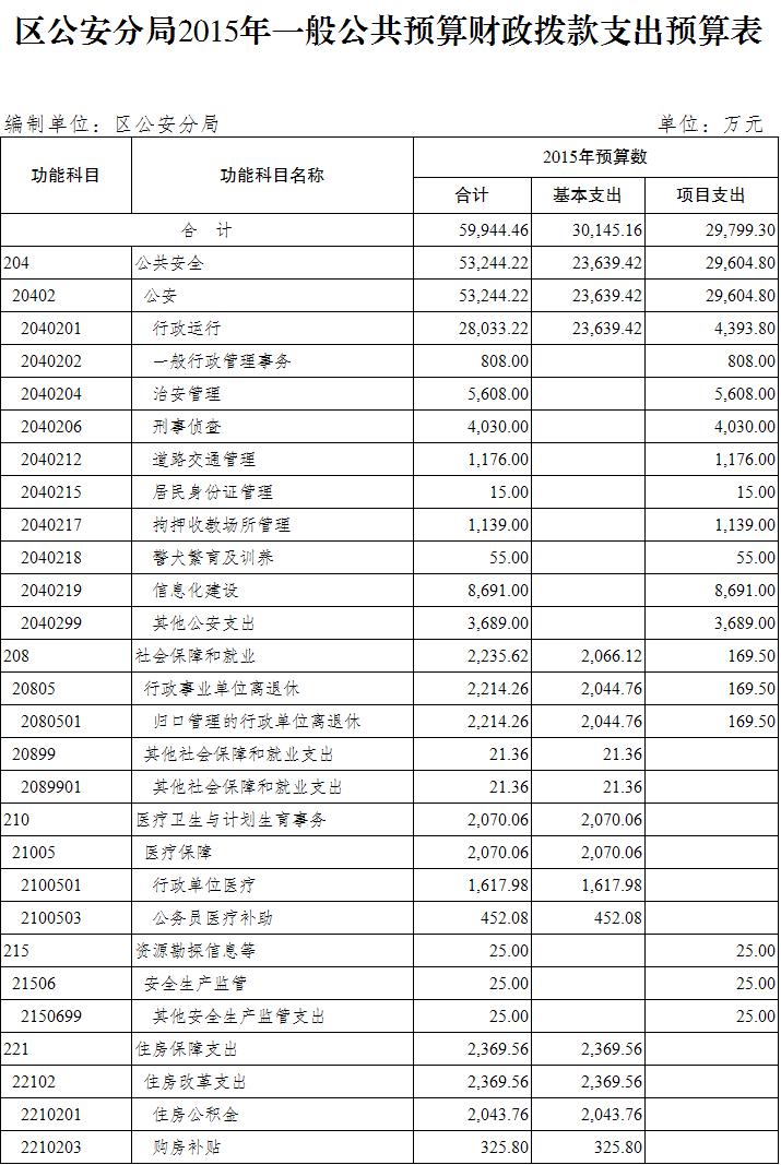2015年,區(qū)公安分局預(yù)算為59944.46萬(wàn)元,其中基本支出為30145.16萬(wàn)元,項(xiàng)目支出為29799.30萬(wàn)元,基本支出主要用于工資福利、行政運(yùn)行、社會(huì)保障和就業(yè)、醫(yī)療衛(wèi)生和住房保障支出;項(xiàng)目支出用于治安管理、刑事偵查、道路交通管理、拘押收教場(chǎng)所管理、居民身份證管理、警犬繁育及訓(xùn)養(yǎng)、信息化建設(shè)、公安裝備購(gòu)置等方面支出.