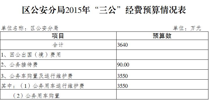 2015年,區(qū)公安分局“三公”經(jīng)費(fèi)預(yù)算為3640萬(wàn)元,比2014年減少62.5萬(wàn)元,其中公務(wù)接待費(fèi)為90萬(wàn)元,公務(wù)車購(gòu)置及運(yùn)行維護(hù)費(fèi)為3550萬(wàn)元。