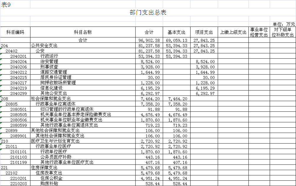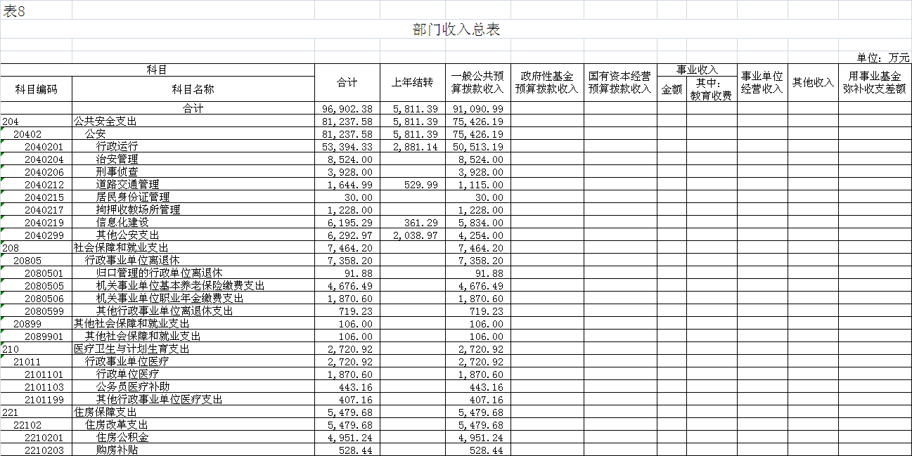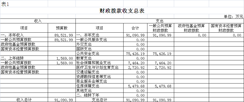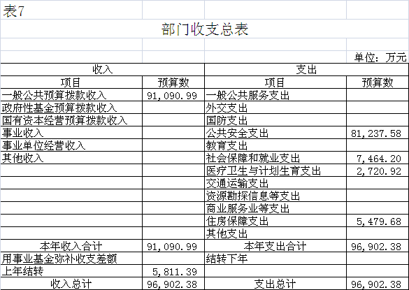2018年財(cái)政撥款收入91090.99萬(wàn)元。收入一般公共預(yù)算撥款91090.99萬(wàn)元,包括:一般公共預(yù)算當(dāng)年撥款收入89521.99萬(wàn)元、上年結(jié)轉(zhuǎn)1569.00萬(wàn)元;支出包括:公共安全支出75426.19萬(wàn)元,社會(huì)保障和就業(yè)支出7464.20萬(wàn)元、醫(yī)療衛(wèi)生與計(jì)劃生育支出2720.92萬(wàn)元、住房保障支出5479.68萬(wàn)元。