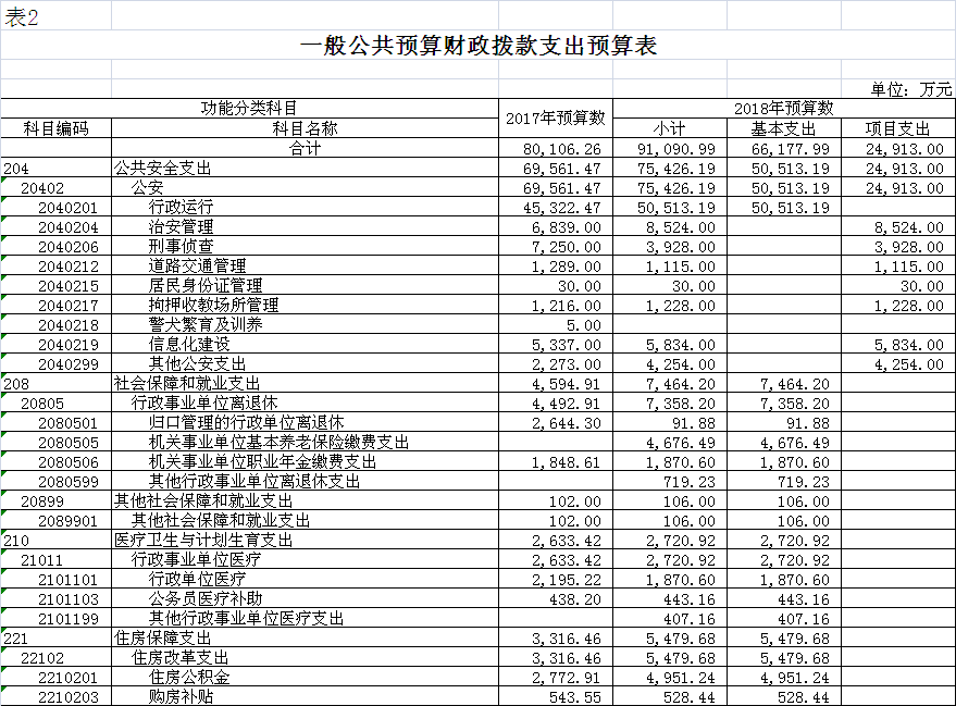 2018年公共安全支出75426.19萬(wàn)元,社會(huì)保障和就業(yè)支出7464.20萬(wàn)元,醫(yī)療衛(wèi)生和計(jì)劃生育支出2720.92萬(wàn)元,住房保障支出5479.68萬(wàn)元,分別比2017年年初預(yù)算增加5864.72萬(wàn)元、2869.29萬(wàn)元、87.50萬(wàn)元、2163.22萬(wàn)元,主要原因是人員經(jīng)費(fèi)和社保繳費(fèi)增加。