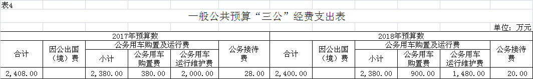 2018年“三公”經(jīng)費(fèi)預(yù)算2400.00萬(wàn)元,其中:因公出國(guó)(境)費(fèi)用0萬(wàn)元,公務(wù)接待費(fèi)20.00萬(wàn)元,公務(wù)用車(chē)運(yùn)行維護(hù)費(fèi)1480.00萬(wàn)元,公務(wù)用車(chē)購(gòu)置費(fèi)900.00萬(wàn)元。2018年“三公”經(jīng)費(fèi)預(yù)算比2017年減少比2017年減少8.00萬(wàn)元,主要原因是嚴(yán)控“三公”經(jīng)費(fèi)支出。