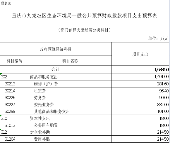 10.2025年重慶市九龍坡區(qū)生態(tài)環(huán)境局一般公共預(yù)算財(cái)政撥款項(xiàng)目支出預(yù)算表(部門經(jīng)濟(jì)分類科目)