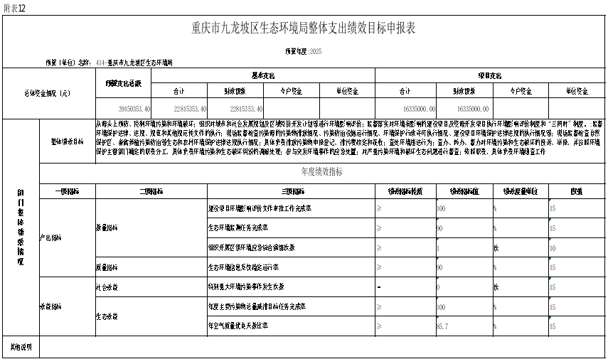 12.2025年重慶市九龍坡區(qū)生態(tài)環(huán)境局部門整體績(jī)效目標(biāo)表