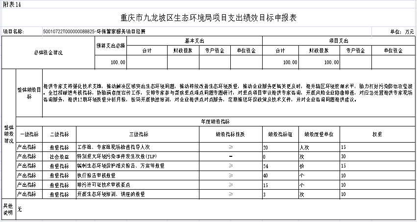 14.2025年重慶市九龍坡區(qū)生態(tài)環(huán)境局項(xiàng)目績(jī)效目標(biāo)表