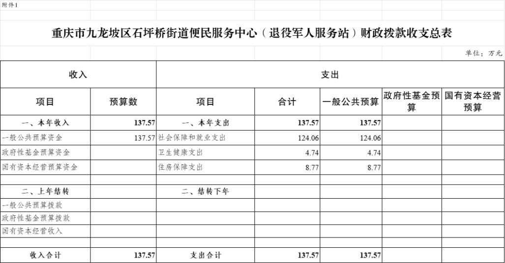 重慶市九龍坡區(qū)石坪橋街道便民服務(wù)中心(退役軍人服務(wù)站)部門收支總表 | |||