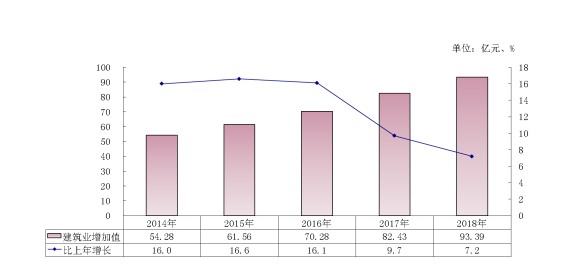 圖3? 2014-2018年建筑業(yè)增加值及其增長速度