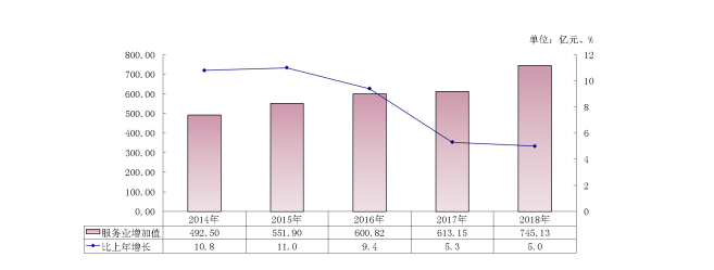 圖4? 2014-2018年服務(wù)業(yè)增加值及其增長速度