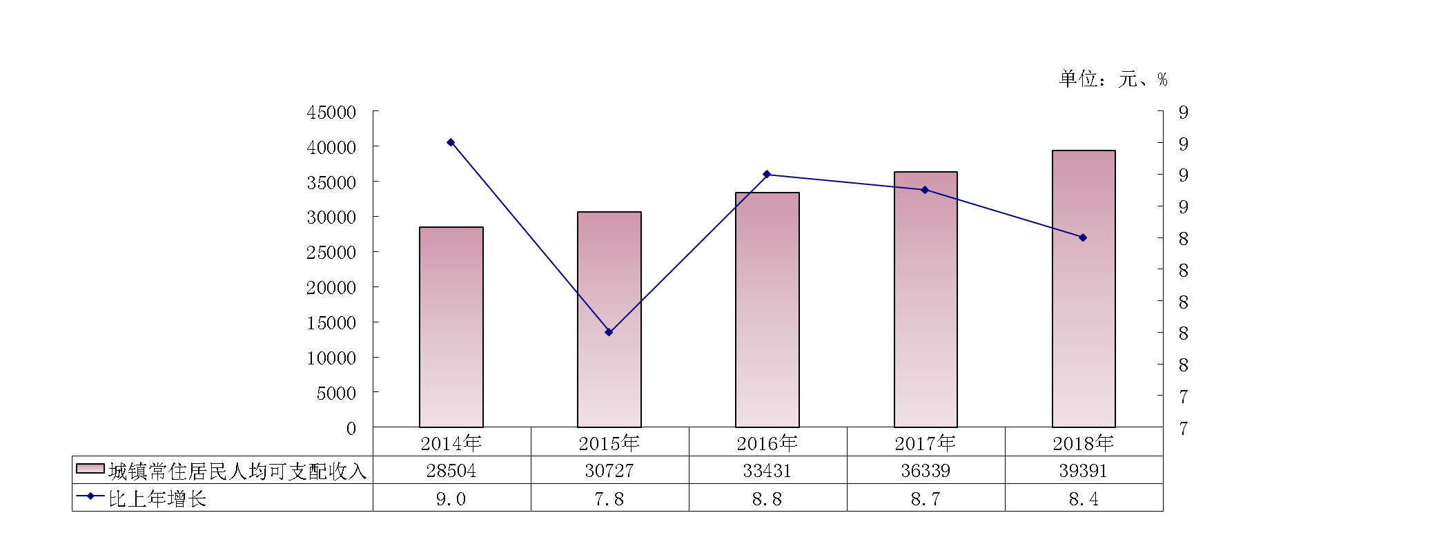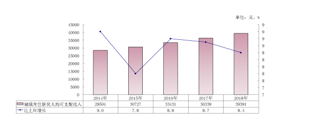 圖6? 2014-2018年城鎮(zhèn)常住居民人均可支配收入及其增長速度