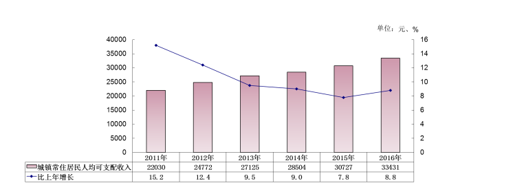 ? 圖6??2011-2016年城鎮(zhèn)常住居民人均可支配收入及其增長(zhǎng)速度