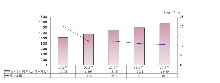 ? ? ? ? ? ? ? ? ? ? ? ? 圖7??2011-2016年農(nóng)村常住居民人均可支配收入及其增長(zhǎng)速度
