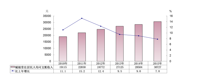?? ??圖6??2010-2015年城鎮(zhèn)常住居民人均可支配收入及其增長速度
