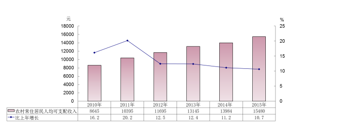 ? ? ? ? ? ? ? 圖7??2010-2015年農(nóng)村常住居民人均可支配收入及其增長速度