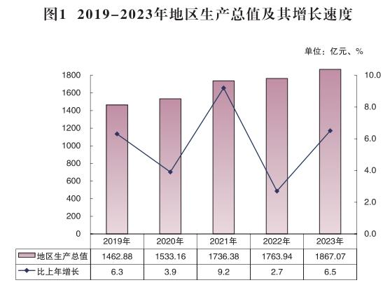 初步核算,全年實現(xiàn)地區(qū)生產(chǎn)總值1867.07億元,按不變價格計算,比上年增長6.5%。按常住人口計算,全年人均地區(qū)生產(chǎn)總值121404元,比上年增長6.1%。
