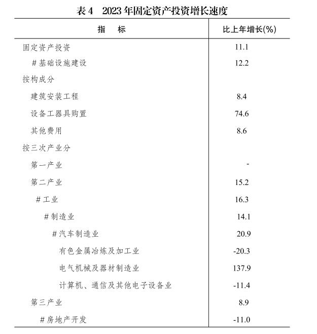 全年固定資產(chǎn)投資總額比上年增長11.1%。其中,基礎(chǔ)設(shè)施建設(shè)投資增長12.2%。分產(chǎn)業(yè)看,第二產(chǎn)業(yè)投資增長15.2%,第三產(chǎn)業(yè)投資增長8.9%。分主要行業(yè)看,工業(yè)投資增長16.3%,房地產(chǎn)開發(fā)投資下降11.0%。