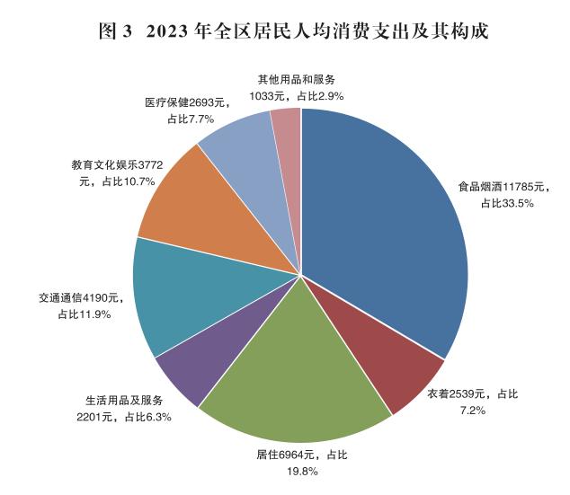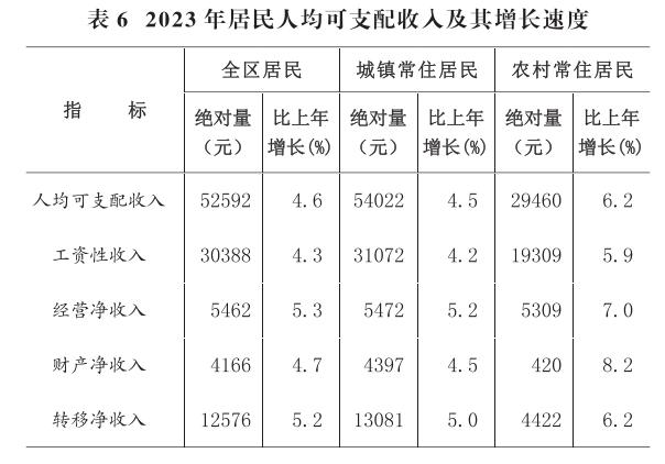 全年全區(qū)居民人均可支配收入52592元,比上年增長4.6%。按常住地分,城鎮(zhèn)居民人均可支配收入54022元,增長4.5%;農(nóng)村居民人均可支配收入29460元,增長6.2%。城鄉(xiāng)居民人均可支配收入比值為1.83,比上年縮小0.03。全區(qū)居民人均生活消費支出35177元,比上年增長4.4%。按常住地分,城鎮(zhèn)居民人均生活消費支出35936元,增長4.2%;農(nóng)村居民人均生活消費支出22899元,增長5.9%。